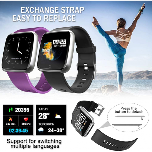 • ★【Multi-function】The smart watch has built-in sensors to track multiple sports modes. Step, distance,calories,Blood Pressure and Stopwatch .Reminder calls, messages, app notifications, including WhatsAPP, Facebook, Twitter and more.Watches support multiple languages: Chinese, English, Korean, German, Spanish, Japanese, French, Italian.